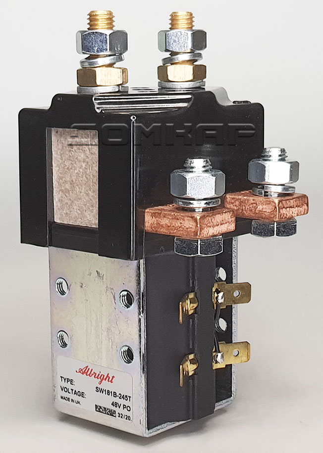 Контактор SW181 Albright был разработан для нагрузок постоянного тока, в частности для электродвигателей, используемых на электромобилях, штабелерах, погрузчиках, гольфкарах и т.п. Разработанный как для прерывистых, так и для непрерывных нагрузок, контактор SW181 подходит для коммутации резистивных, емкостных и индуктивных нагрузок. Контактор SW181 Albright оснащен однополюсными основными контактами с двойным броском и двойным размыканием с наконечниками из серебряного сплава, которые устойчивы к сварке, износостойки и обладают превосходной проводимостью. Контактор SW181 имеет основные клеммы со шпильками M8 и 6,3-миллиметровые соединения лопастных катушек. Он может монтироваться с помощью резьбовых отверстий M4 или монтажных кронштейнов – как в комплекте, так и в виде отдельных элементов. Монтаж может быть горизонтальным или вертикальным, при вертикальном положении контактные шпильки M8 должны быть направлены вверх. Пожалуйста, обратите внимание, что нормально замкнутые контакты не подходят для создания и размыкания нагрузки.