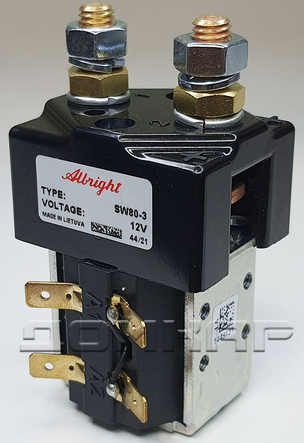 Контактор SW80-3 Albright был разработан для нагрузок постоянного тока, включая электродвигатели, используемые на электромобилях, штабелерах, погрузчиках, гольфкарах, а также для телекоммуникаций и распределения электроэнергии. Разработанный как для прерывистых, так и для непрерывных нагрузок, контактор SW80-3 подходит для коммутации резистивных, емкостных и индуктивных нагрузок. Контактор SW80-3 Albright оснащен однополюсными основными контактами с двойным размыканием с наконечниками из серебряного сплава, которые устойчивы к сварке, износостойки и обладают превосходной проводимостью. Контактор SW80-3 имеет основные клеммы со шпильками M8 и 6,3-миллиметровые соединения лопастных катушек. Монтаж осуществляется с помощью резьбовых отверстий M4 или монтажных кронштейнов, которые поставляются либо в комплекте, либо в виде отдельных элементов. Монтаж может быть горизонтальным или вертикальным, при вертикальном положении контактные шпильки M8 должны быть направлены вверх.