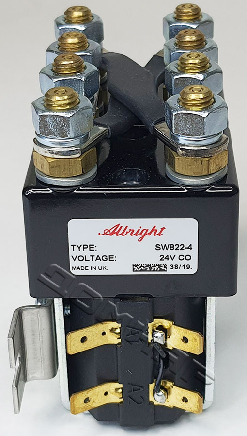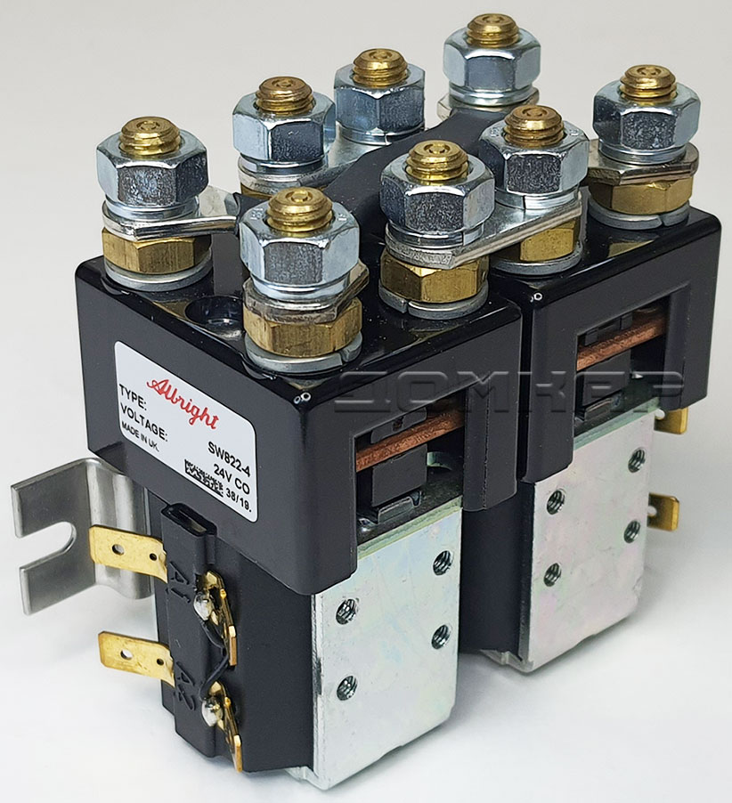 Контактор SW822-4 Albright был разработан для нагрузок постоянного тока, в частности для электродвигателей, используемых на электромобилях, штабелерах, погрузчиках, гольфкарах и на электротранспорте для аэропортов. Разработанный как для прерывистых, так и для непрерывных нагрузок, контактор SW822-4 подходит для коммутации резистивных, емкостных и индуктивных нагрузок. Контактор SW822-4 Albright оснащен основными контактами двойного размыкания с наконечниками из серебряного сплава, которые устойчивы к сварке, износостойки и обладают превосходной проводимостью. Контактор SW822-4 имеет основные клеммы со шпильками M8 и 6,3-миллиметровые соединения лопастных катушек. Монтируется с помощью прилагаемых кронштейнов, монтаж может быть горизонтальным или вертикальным, при вертикальном положении контактные шпильки M8 должны быть направлены вверх.
