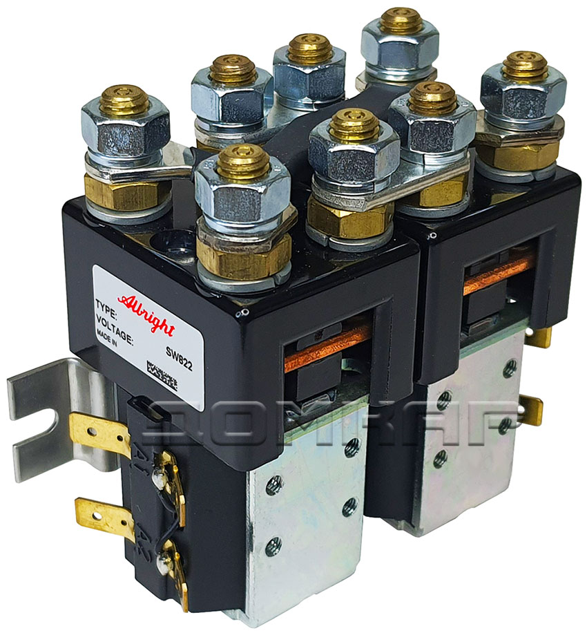 Контактор SW822 Albright был разработан для нагрузок постоянного тока, в частности для электродвигателей, используемых на электромобилях, штабелерах, погрузчиках, гольфкарах и на электротранспорте для аэропортов. Разработанный как для прерывистых, так и для непрерывных нагрузок, контактор SW822 подходит для коммутации резистивных, емкостных и индуктивных нагрузок. Контактор SW822 Albright оснащен основными контактами двойного размыкания с наконечниками из серебряного сплава, которые устойчивы к сварке, износостойки и обладают превосходной проводимостью. Контактор SW822 имеет основные клеммы со шпильками M8 и 6,3-миллиметровые соединения лопастных катушек. Монтируется с помощью прилагаемых кронштейнов, монтаж может быть горизонтальным или вертикальным, при вертикальном положении контактные шпильки M8 должны быть направлены вверх.