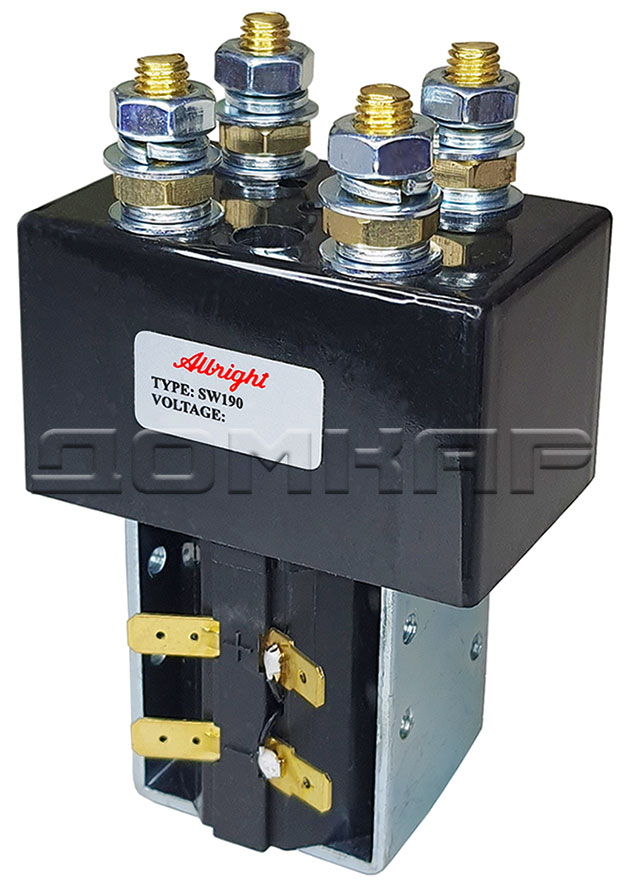 Контактор SW190 Albright был разработан для нагрузок постоянного тока, в частности для электродвигателей, используемых на электромобилях, штабелерах, ричтраках, погрузчиках, гольфкарах и т.п. Разработанный как для прерывистых, так и для непрерывных нагрузок, контактор SW190 подходит для коммутации резистивных, емкостных и индуктивных нагрузок. Контактор SW190 Albright оснащен однополюсными основными контактами с двойным размыканием и наконечниками из серебряного сплава, которые устойчивы к сварке, износостойки и обладают превосходной проводимостью. Контактор SW190 имеет основные клеммы со шпильками M8 и 6,3-миллиметровые соединения лопастных катушек. Он может монтироваться с помощью резьбовых отверстий M5 или монтажных кронштейнов – как в комплекте, так и в виде отдельных элементов. Монтаж может быть горизонтальным или вертикальным, при вертикальном положении контактные шпильки M8 должны быть направлены вверх.